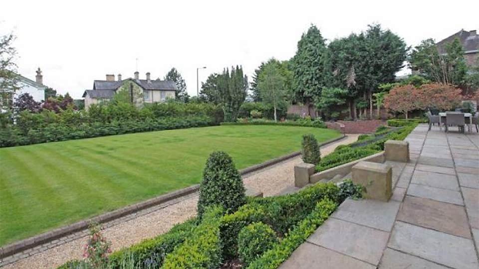 The clients had requested that the driveway reflect the style of the house. Here a paver was chosen that complemented the stunning slate roof on the house. Granite setts were used as edging with aco drains sited accordingly. Recessed led lights were also used amongst the setts. The Curved drive walls were rendered in an off white with inset lighting. Cheshire beestone sanstone walls were built surrounding the property.
